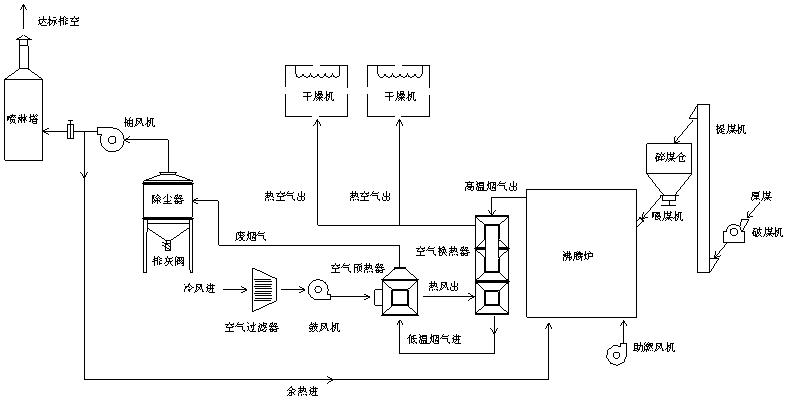 經(jīng)過項目小組的討論與研究,本系統(tǒng)采用了沸騰爐、列管式換熱器、多管+水膜除塵等工藝組成,沸騰爐采用流化床燃燒技術(shù),燃料適應(yīng)性廣,能燃用熱值低于3000kcal/kg的各種煤,且供熱溫度溫度可調(diào),調(diào)溫迅速,燃燼率高達(dá)99%;列管式換熱器高溫段采用耐熱不銹鋼材質(zhì),并設(shè)計獨(dú)特的梅花狀噴流管結(jié)構(gòu),能有效提升換熱效率,合理的管束排列,能控制煙氣流速穩(wěn)定在10m/s,可避免管子積灰;除塵系統(tǒng)為干法+濕法方案,即廢煙氣先經(jīng)過多管多除塵器,該除塵器由多個陶瓷旋風(fēng)子組成,除塵效率可達(dá)95%以上,風(fēng)阻小于900Pa,運(yùn)行成本低;再進(jìn)入水膜除塵塔,可對廢氣進(jìn)一步凈化,加入脫硫劑,可對煙氣進(jìn)行脫硫。